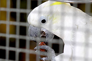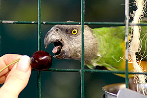 Figaro und Jerry, der Gelbhaubenkakadu, beim Kirschenschmaus.