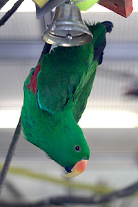 Edelpapagei Bobi hängt sich an das grosse Glockenspielzeug.