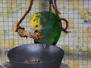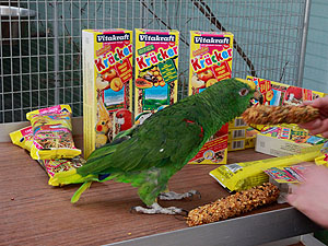Blaustirnamazone Coco hat bereits ihren Kräcker ausgehängt und
