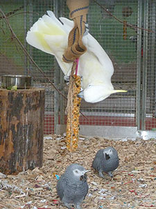 Gelbwangenkakadu und seine Volierengenossen, die Grauen Romeo und