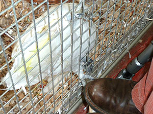 der Voliere und schon streckt Köbeli seine Kralle durchs Käfig
