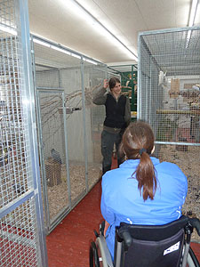 Cathrin die Volieren mit Kräcker bestückt.