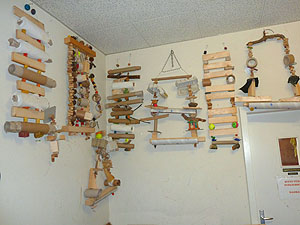 und kauft geflochtene Körbe. Die Vögel lieben seine Spielsachen.