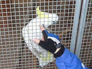 Hugo, ein grosser Gelbhaubenkakadu. Ich lenke ihn ab. Zu gerne würde er mir die Schuhe auseinander