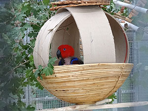 Edelpapageihenne sitzt stundenlang in Verstecken. Hier hat sie von