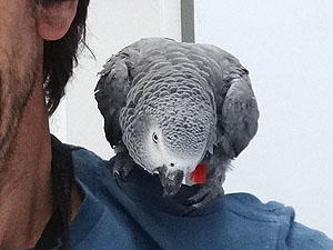 seine Schulter. Das ist Lara, ein ganz netter Graupapagei.