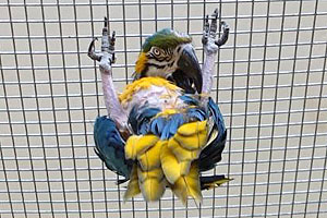 Blaustirnamazone Rao klettert über Kopf. Die Vögel müssen sich