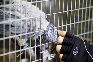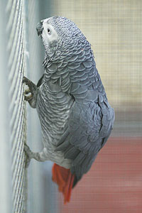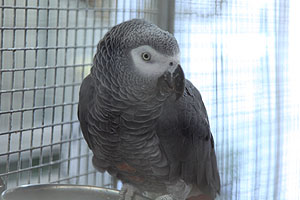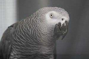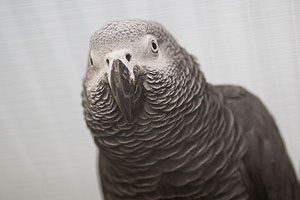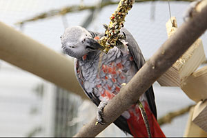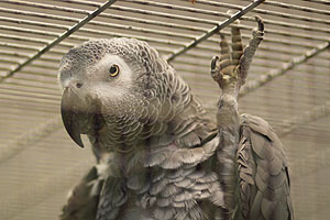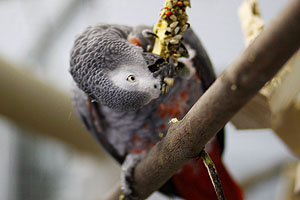 Graupapagei Coco beim täglichen Training.