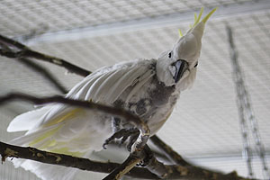 Der Weisshaubenkakadu Strupi stellt vor Freude seine grosse Federhaube.