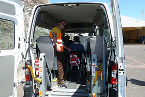 dem Rollstuhl zum Helikopter, ein- und aussteigen